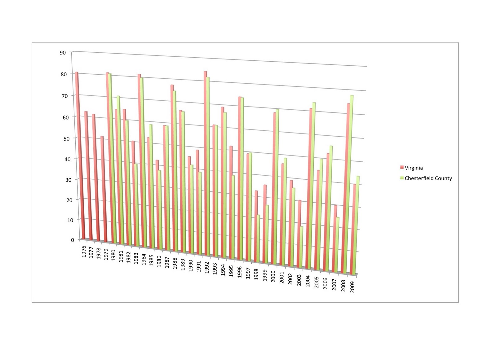 And when compared with Chesterfield County, a similar pattern is noted: Of particular interest is the 19% turn out in Chesterfield County in 2003. This is 19% of registered voters – 31961 county residents voted in that election, in a county that in 2003 was 278,000 – 11.5% of the population actually voted. The majority won the various local offices, by even smaller margins for local district races. This was rule by majority that was in fact rule by a small minority.